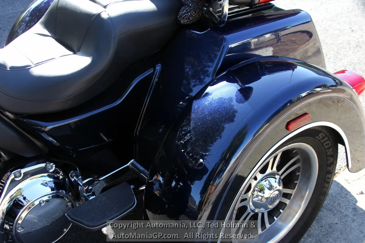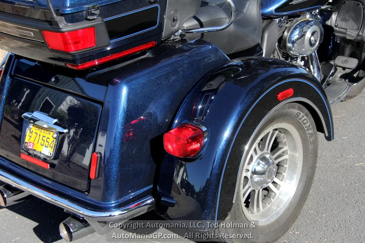 This 2013 Harley Davidson Tri-Glide FLHTCUTG is in beautiful cosmetic condition and accompanied by a $2,760 service completed by D&S Harley Davidson less than 1,600 miles ago. New tires, oils services and a tune up, the bike is now only missing additional fuel and a destination for it’s new owner. One of the items seen while looking over the bike was the upgraded Harley Hub Caps on the rear wheels. Nice touch (the stock covers are included)