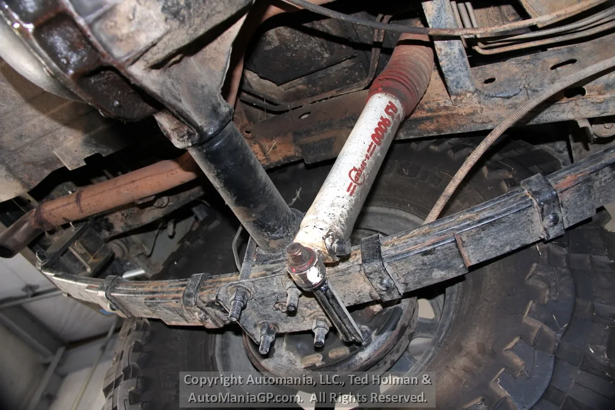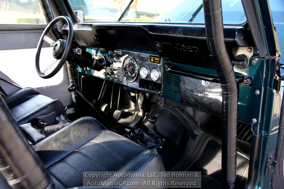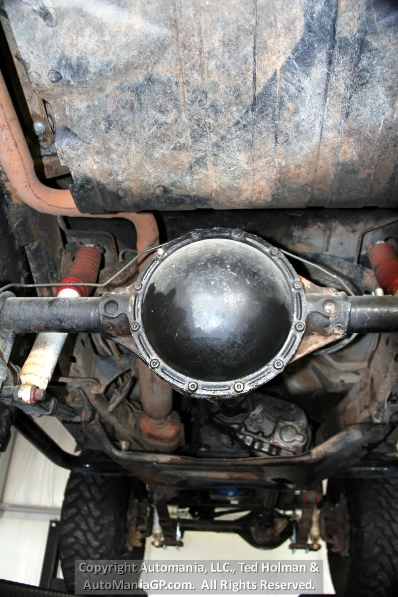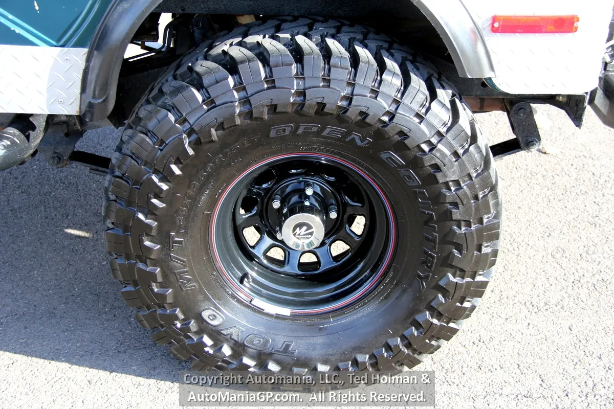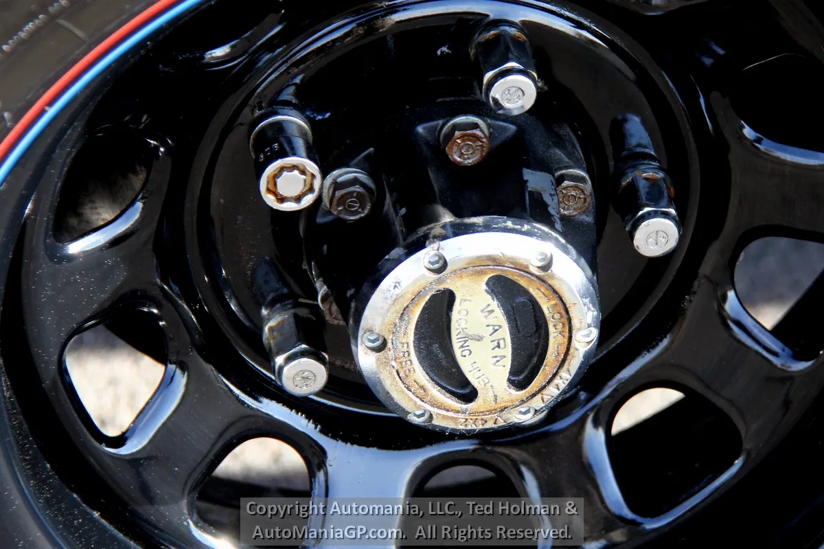 The engine is the AMC 258 6-Cylinder and a 4-Speed Manual Transmission and 2-Speed Transfer Case with 2H and Neutral along with Warn Locking Hubs. Wheels and tires look almost new and 35’s Toyo’s are mounted. The 4WD was checked out here at the shop and everything worked as expected. Nice Hubs!